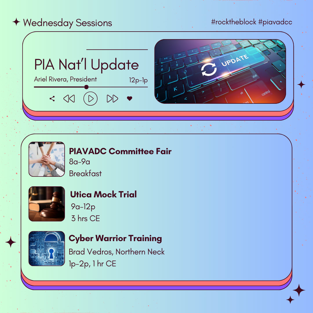 We look forward to having Scott White, Commisioner of the Virginia State Corporation Commission's Bureau of Insurance; Ariel Rivera, PIA National President; Kristen H. Martin, President & CEO of Utica National Insurance Company; Heath Shearon, Mayor/Host/Emcee, as speakers this year.